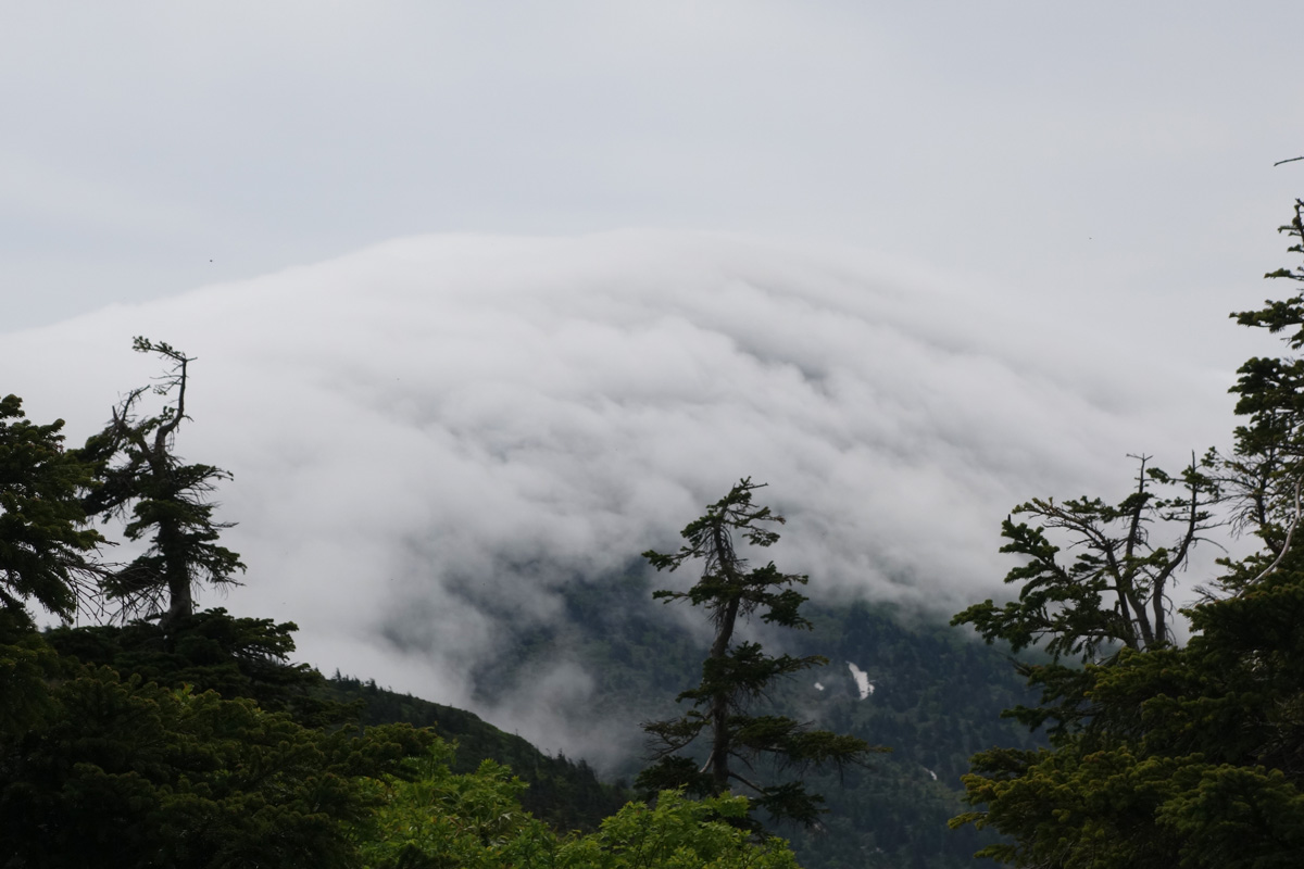 3日目(6月12日)の朝は、どんよりと曇っていました。。雨の心配もありましたが、もう一度八甲田ロープウェイに向かいます。ホテルでロープウェイの200円割引券をもらいました。ロープウェイ乗り場に着いた時には、低い雲は無くなっていました。山頂駅では、赤倉岳、井戸岳の方から毛無岱(けなしたい)へ流れて消えてゆく雲の流れが遠望できました。