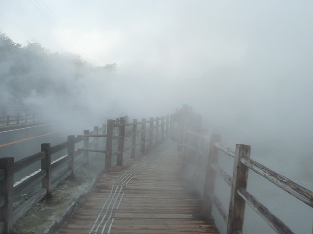 雲仙温泉での宿は、「九州ホテル」です。この宿は雲仙地獄のすぐ前にあり、部屋からの雲仙地獄の眺めがとってもいいんです。部屋に着いたら、(まず車を充電に持って行って)早速地獄の散策です。硫黄の臭いと前が見えないほどの湯けむりです。