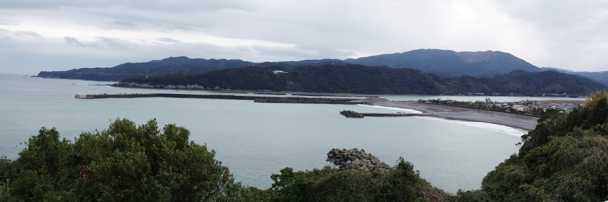 竹島大師堂に着く頃にやっと雨が上がった。午後は川沿いに河口の方に歩き、下田港から土佐西南大規模公園に入り、隣接する「四万十の宿」に泊まる。