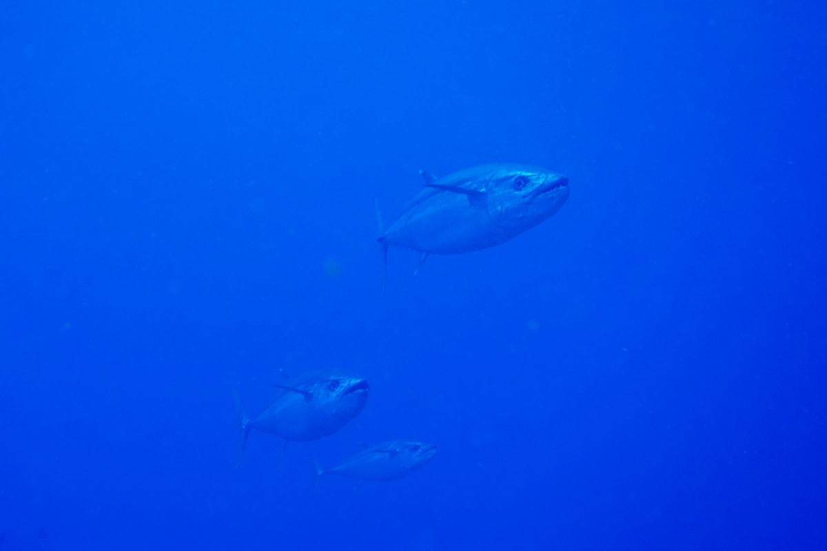 ギンガメやカマスの群れ、近づくと離れる。海中暗い。